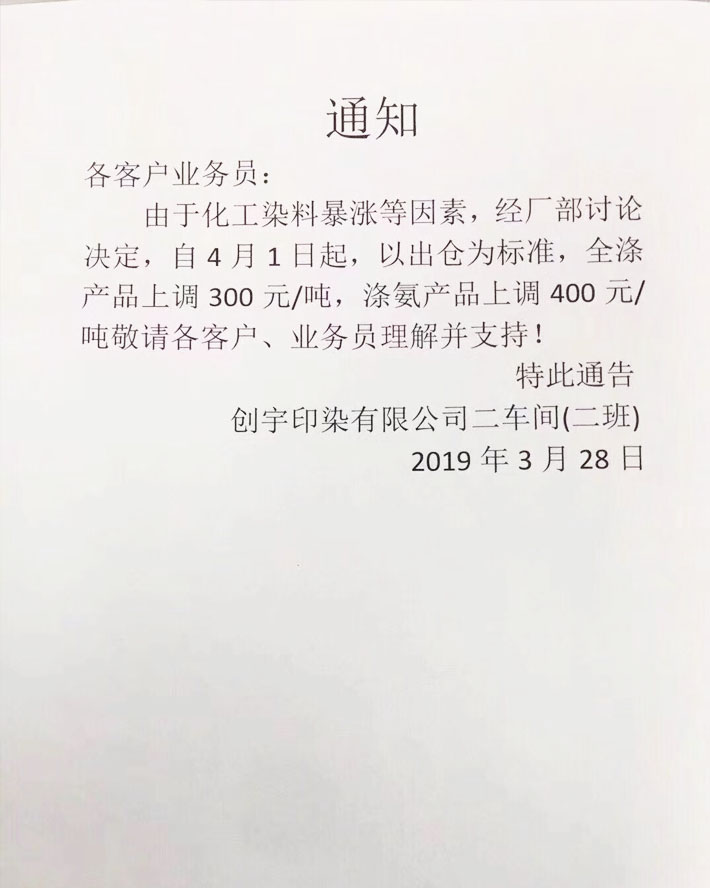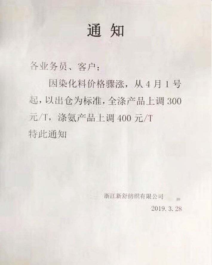 航民达美染整通知称,自2019年3月25日的成品出仓起,部分梭织类染色及印花上调价格。杭州天宇印染称,因染化助剂染料价格大幅调整,自3月24日起,梭织类产品统一上调0.15元/米,全涤针织类统一上调300元/吨。
