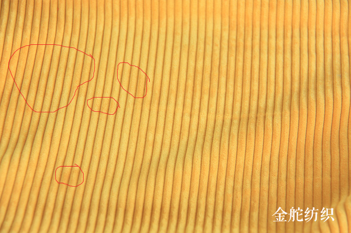 灯芯绒面料表面的霜花效果,圈起来的部位是手碰触过后,毛立起来,颜色变深。
