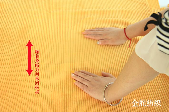 区别灯芯绒的倒顺毛,我们就可以从这两点出发,顺着条绒的方向,用巴掌抹动一下,抹下去发白的,毛趴下去的是顺毛方向,而抹过去,毛立起来,颜色变深的则为倒毛方向。顺毛方向手抹过去,会比较顺滑,倒毛方向抹过去,有会阻力的产生。这也是灯芯绒面料同一卷布,把两遍会出现两个米数的缘故。