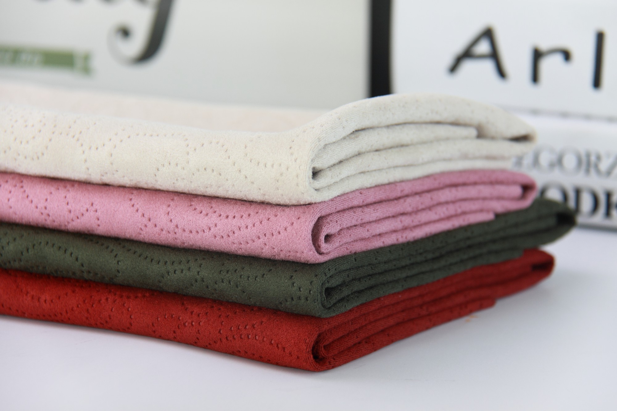 该面料厚实柔软,绒感细腻,弹性好,是秋冬高档面料不二的选择!空气层麂皮绒选用海岛丝105D+40D氨纶丝(涤纶含量90%,氨纶含量10%),