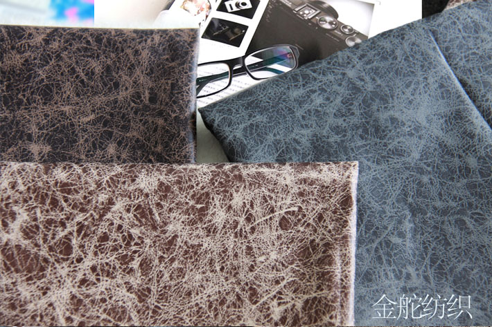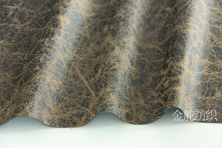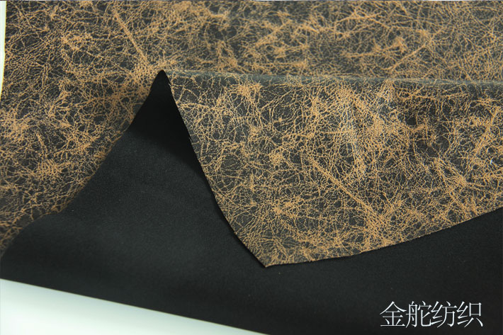 该面料选用梭织纬向麂皮绒,进行烫金工艺加工,具有较好的皮膜效果,硬挺耐磨,胶水复合6米黑色针织布,透光率低,可做仿皮抱枕,沙发套,遮光窗帘面料。可按客户来样开发定制花型。