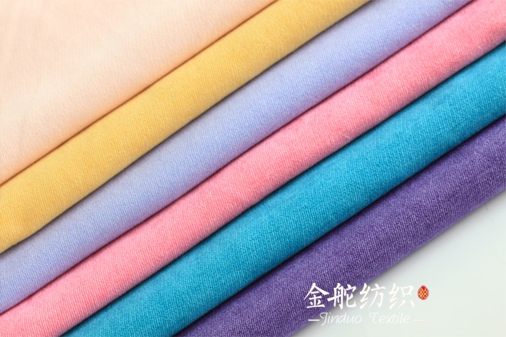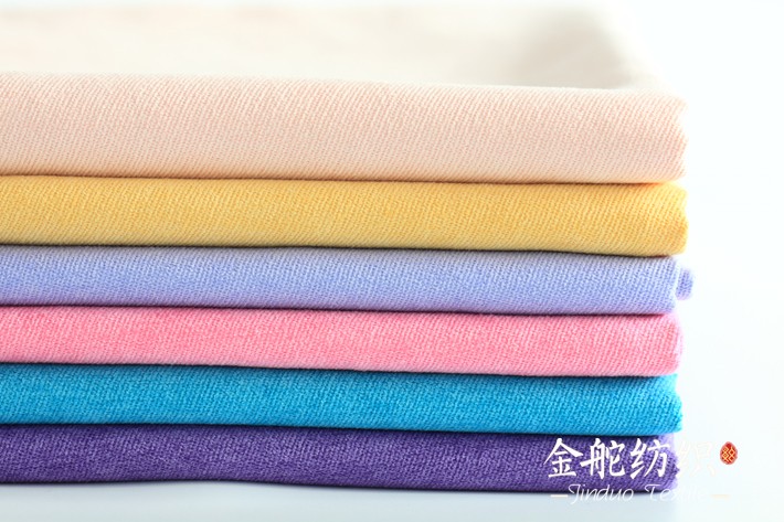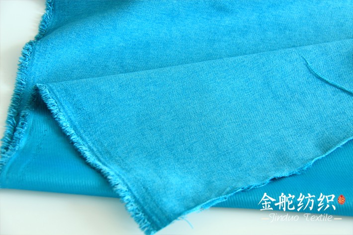 纤丝绒,喷水织机织造,斜纹织物,经开纤,磨毛,染色,定型,梳毛等工艺生产而成,表面形成斜纹细条绒,类似21条灯芯绒的条绒效果,没有经过割绒,绒毛效果而是由磨毛而来,结构紧密,不易掉毛,这是这款面料跟灯芯绒面料的差别。